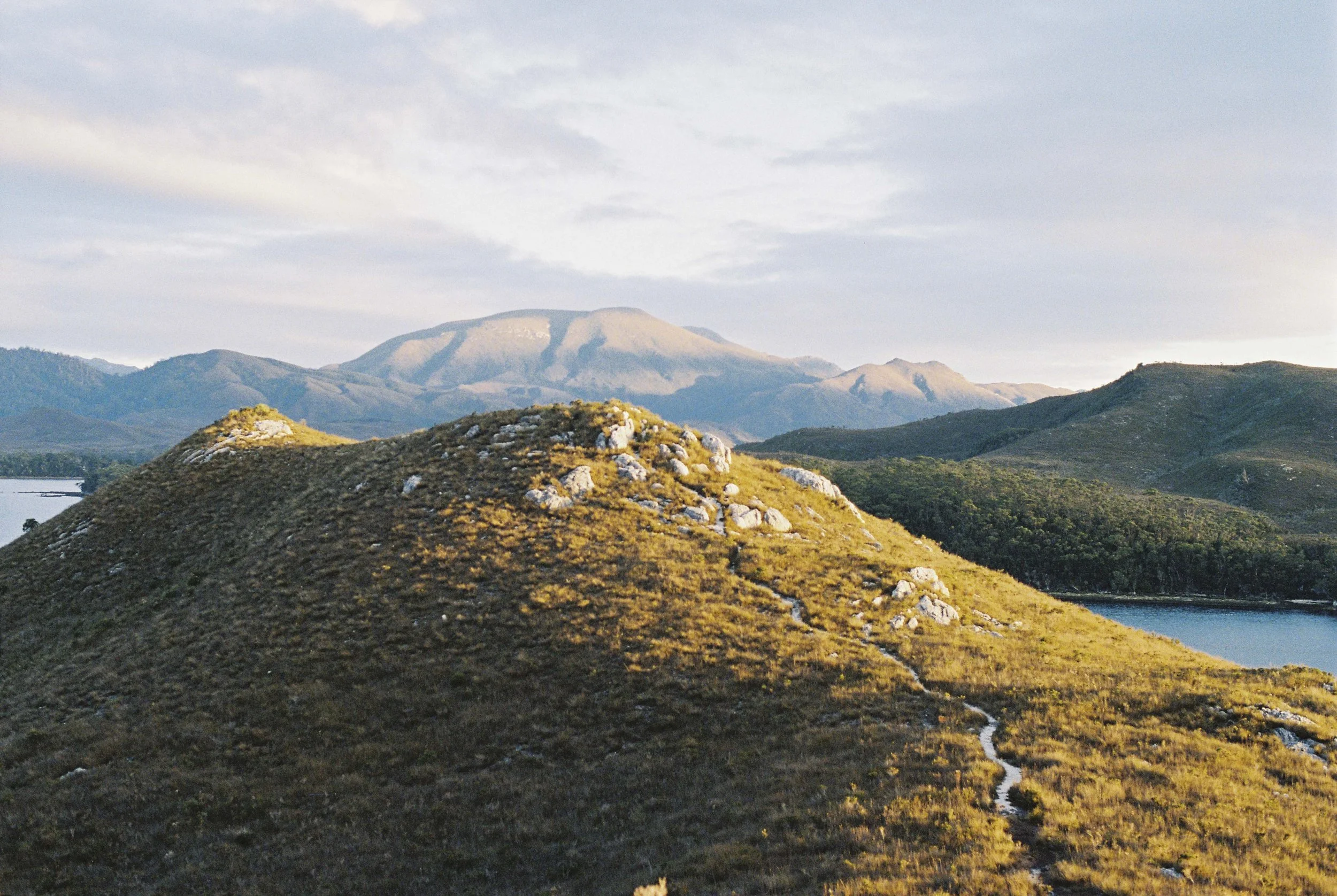 Gabe standing in the saddle with Port Davey behind. Pentax MX, Portra 800, Nov 2025.
