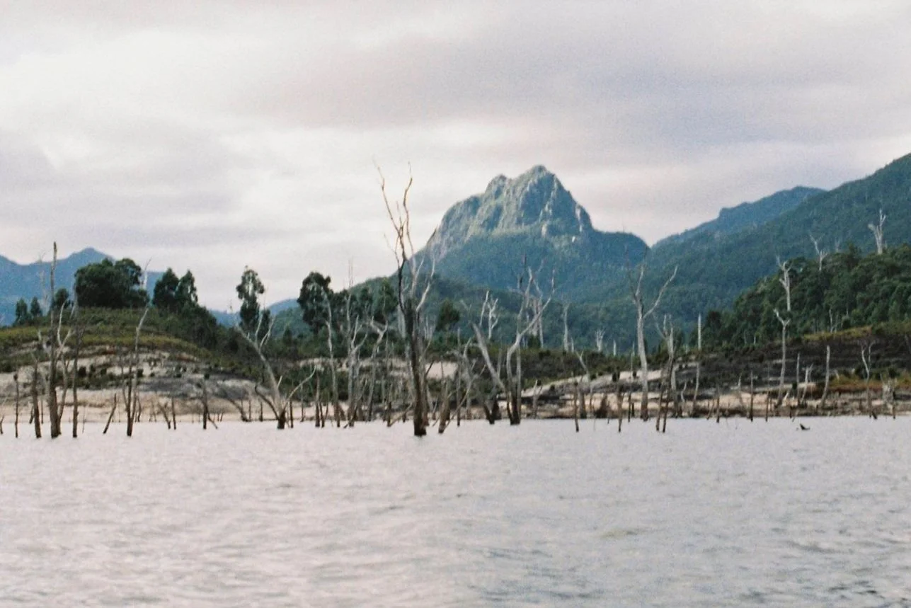 It was flooded over fifty years ago, when they built the dam across the Gordon River. The dead stags of massive eucalypts that died over half a century ago still hang eerily over the water. I paddled among the ghosts of those trees. There was no wind and all was quiet.