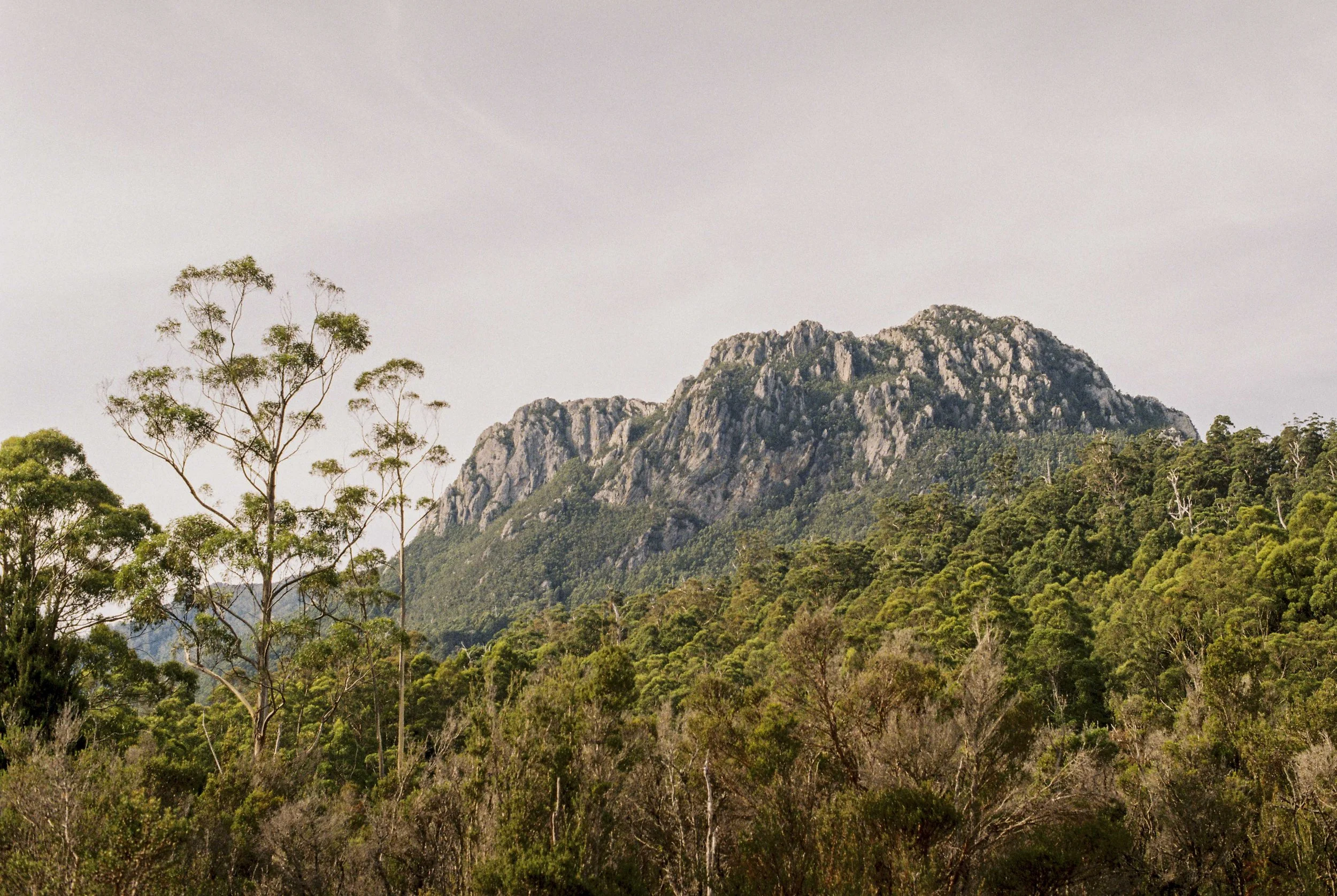 The open buttongrass plain led me to the river, which I followed on higher ground, crossing a number of gullies. Buttongrass and tea trees are the best of friends, and it is unusual to cross the gullies without finding tea trees that close above the head and grow close together. Slowly but surely the mountain on my right rose up higher as I got closer with each step. The mountain on my left also rose up as well; a potential adventure for another time. I only had a four day window, and I was keen to focus my energy on the mountain that drew me here.
