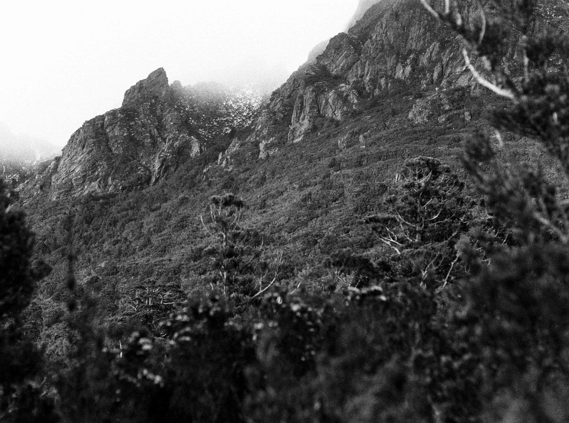 We ascended through dwarfed rainforest with our packs getting snagged many times. Eventually the vegetation transitioned to old growth scoparia that went well above our heads. We sidled at the base of the cliffs of Geeves Bluff and took an open-ish lead up a ramp to drop into the final sidle towards the main gully leading up to the ridge above Hanging Lake.