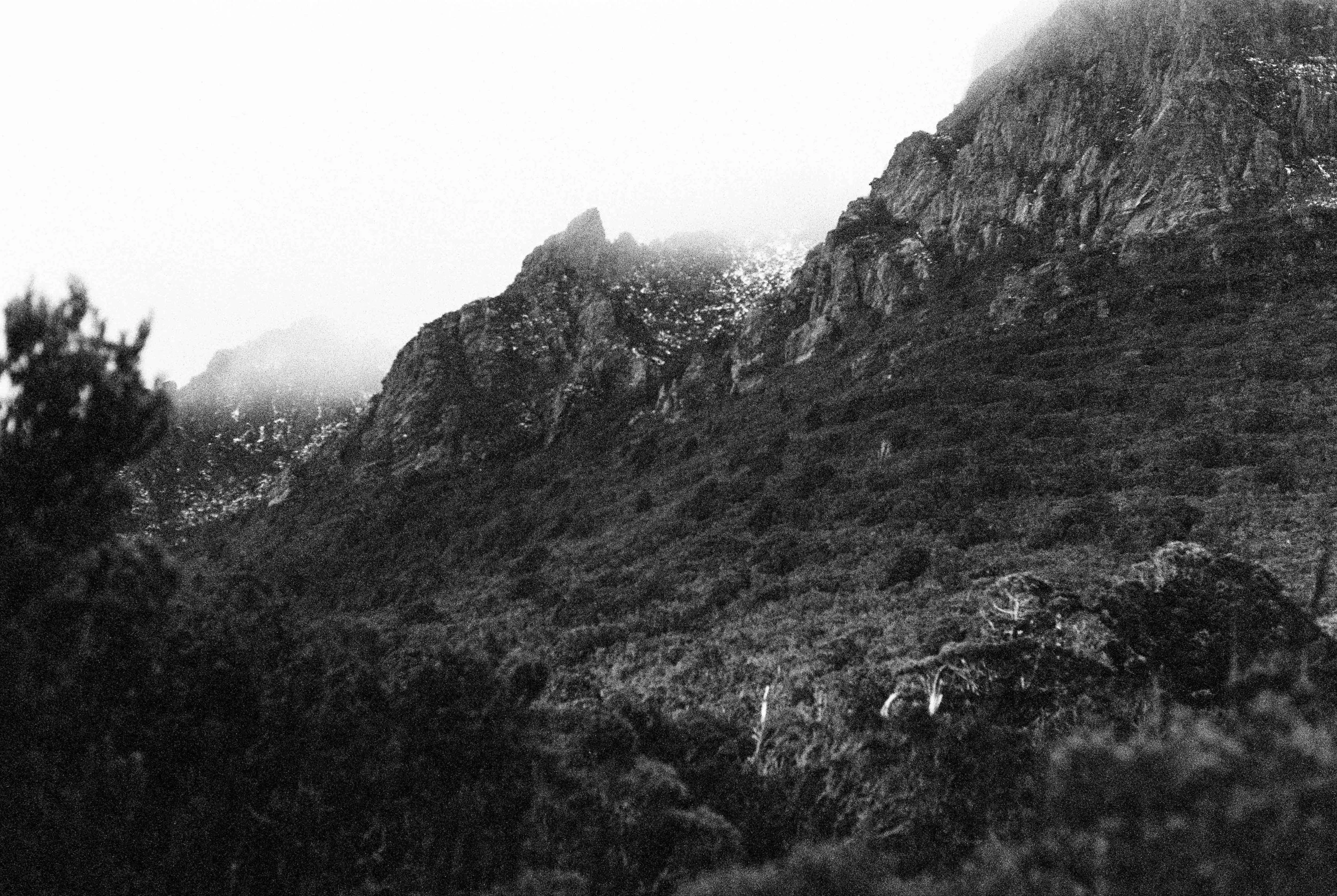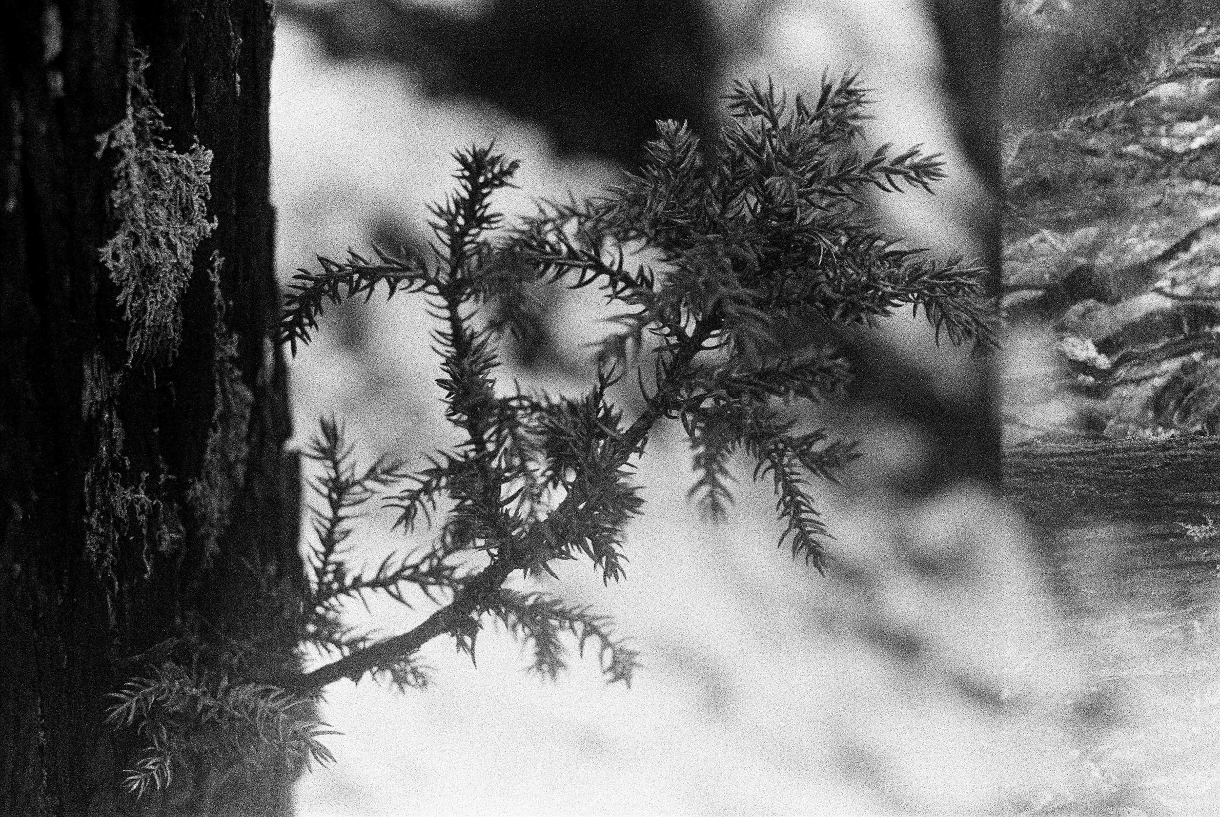 Fresh snow on Geeves Bluff. Pentax MX, Ilford XP 2 Super, Nov 2025.